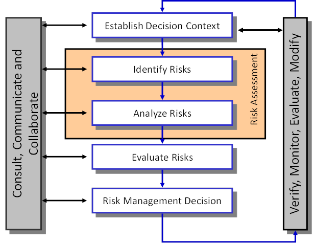 The Corps model for managing risk focuses on a multi-part risk assessment process supported through ongoing communication and consultation and regular monitoring and evaluation.